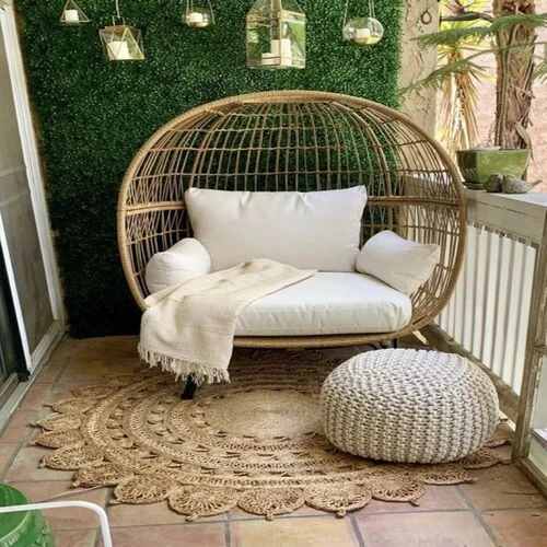 Petit balcon bohème - fauteuil egg en rotin et tapis en jute